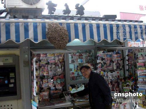 4月13日,蘇州人民路上一家信息亭的遮陽(yáng)棚上聚集了大量的黃蜂,嚇得路人躲而避之。據(jù)悉,當(dāng)日中午12點(diǎn)左右遮陽(yáng)棚上還只是幾只黃蜂,后來越積越多,至下午5時(shí)左右已形成一個(gè)巨大的黃蜂窩,蜂窩直徑達(dá)40厘米,厚度也達(dá)4厘米,晚上9時(shí)左右黃蜂窩被消防官兵成功摘除。據(jù)行家分析,其原因可能是中午蜂王停在了信息亭的遮陽(yáng)棚上,才引來大量的黃蜂聚集在了一起。中新社發(fā) 王建康 攝