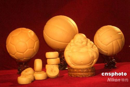 中新網(wǎng)北京四月十五日電 (王歡)中國農(nóng)民用先進科技培育出的世界上獨一無二的足、籃、排三大球造型葫蘆,今天在北京國際會議中心亮相,他們的培育者查泰山將這些“葫蘆”工藝品贈送給中國體育博物館,表達了中國億萬農(nóng)民對北京奧運會的祝福和期盼。