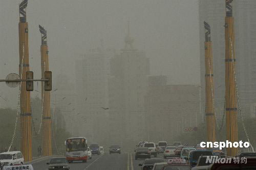 4月23日下午,在新疆庫爾勒市街頭,汽車在沙塵當(dāng)中行駛。在4月18日--19日遭遇沙塵暴襲擊后,新疆庫爾勒于23日下午16時(shí)開始,再次遭遇沙塵襲擊。中新社發(fā) 確·胡熱 攝