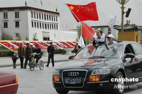 圖:網(wǎng)友自發(fā)組織的奧運(yùn)助威車(chē)隊(duì)駛過(guò)拉薩布達(dá)拉宮