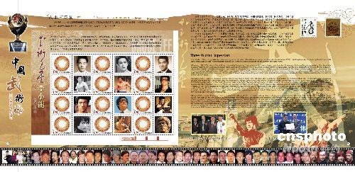 5月9日,全球首部以詳盡介紹武術(shù)發(fā)展為選題的郵票珍藏冊(cè)《中國(guó)武術(shù)》在北京舉行了首發(fā)式。鑒于李小龍將中國(guó)武術(shù)推向世界的貢獻(xiàn),中國(guó)武術(shù)協(xié)會(huì)特意留出一個(gè)版面專門(mén)介紹,并首次推出不干膠的李小龍肖像個(gè)性郵票,肯定了其在武術(shù)界的地位。中新社發(fā) 王歡 攝