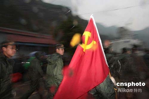 5月13日,中國空降兵6500多名官兵分別乘坐空軍遠(yuǎn)輸機(jī)奔赴四川重災(zāi)區(qū),分五路兵力,分別在什邡、德陽、茂縣、等重災(zāi)區(qū)展開救援。圖為共產(chǎn)黨員沖在搶險救災(zāi)第一線。中新社發(fā) 譚超 攝