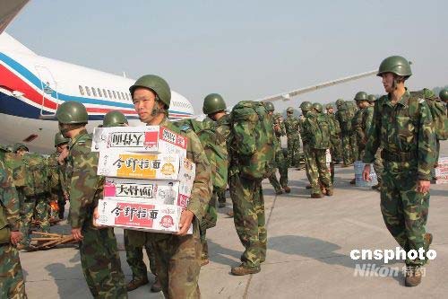 5月13日,空降兵6500多名官兵分別乘坐空軍遠(yuǎn)輸機奔赴四川重災(zāi)區(qū),分五路兵力,分別在什邡、德陽、茂縣、等重災(zāi)區(qū)展開救援。圖為空降兵自帶干糧出發(fā)。中新社發(fā) 譚超 攝