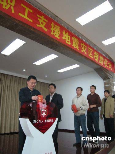 5月12日四川發(fā)生強(qiáng)烈地震后,遼寧民眾情牽災(zāi)區(qū)。從5月14日開始,遼寧各企事業(yè)單位干部和職工紛紛踴躍捐款,支援四川抗震救災(zāi)。圖為14日上午,遼寧省民政廳300余名干部和職工熱心捐款。中新社發(fā) 沈殿成 攝