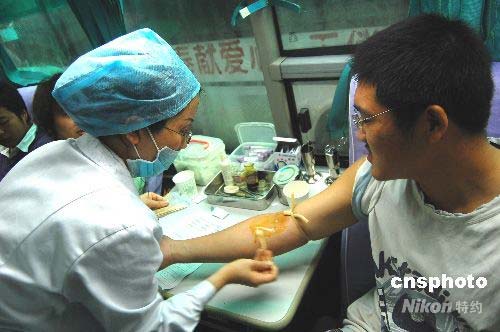 5月14日,重慶市西南大學(xué)育才學(xué)院近500名同學(xué)冒著大雨排隊(duì)獻(xiàn)血。重慶市合川區(qū)血液中心來(lái)到校園進(jìn)行采集血液,引起了大量學(xué)生的踴躍報(bào)名獻(xiàn)血,場(chǎng)面一度失控。同學(xué)們血脈相通汶川,紛紛表示了對(duì)災(zāi)區(qū)人民的慰問(wèn)之情。血液中心負(fù)責(zé)人介紹說(shuō),當(dāng)天采集了200余名學(xué)生的血液,將馬上運(yùn)送到最需要的災(zāi)區(qū)。中新社發(fā) 許康平 攝