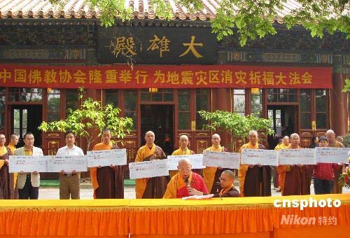 四川省汶川縣發(fā)生七點(diǎn)八級(jí)地震后,中國(guó)佛教協(xié)會(huì)十四日上午在北京廣濟(jì)寺隆重舉行消災(zāi)祈福大法會(huì)。現(xiàn)場(chǎng)賑災(zāi)捐款絡(luò)繹不絕,十一世班禪大師捐款十萬(wàn)元人民幣。中新社發(fā) 徐長(zhǎng)安 攝