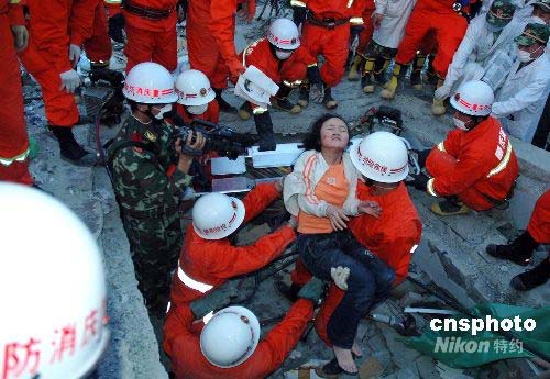 5月14日,重慶消防抗震救災(zāi)突擊隊官兵成功救出一名幸存者。13日晚19時30分,重慶消防抗震救災(zāi)突擊隊首批力量200名官兵歷經(jīng)12小時的長途奔襲,順利抵達(dá)北川中學(xué),并全面展開救援。截至14日下午19時,重慶消防抗震救災(zāi)突擊隊首批力量已成功從廢墟中救出22條生命。中新社發(fā) 萬明 攝