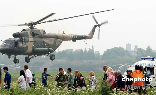 5月15日,來自英、法、美等國家的三十三名游客,被中國軍方用軍用直升機從地震重災區(qū)之一的四川臥龍救出。目前,這些游客健康狀態(tài)良好,已被送往成都市區(qū)。中新社發(fā) 盛佳鵬 攝