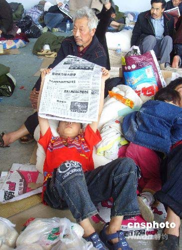 5月15日上午,來自北川地震災區(qū)的群眾生活穩(wěn)定,一位小學生在綿陽市最大的抗震救災救助點九州體育館內認真讀報,了解災情。中新社發(fā) 霍潺 攝