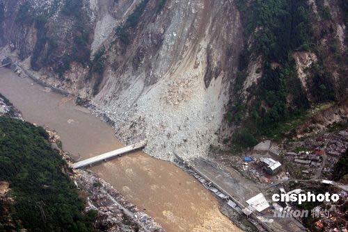 5月15日,在地震中中斷的汶川縣公路仍未完全修復(fù),這是當(dāng)日航拍的垮塌公路橋梁。此次大地震中,位于震中的汶川縣附近道路受到嚴(yán)重破壞,救災(zāi)部隊、人員和醫(yī)療、生活物資遲遲不能從陸路進(jìn)入。中新社發(fā) 張雷 攝