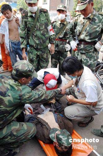 5月15日下午,解放軍某部在北川地震重災(zāi)區(qū)任家坪村救出幸存者。中新社發(fā) 陳文 攝