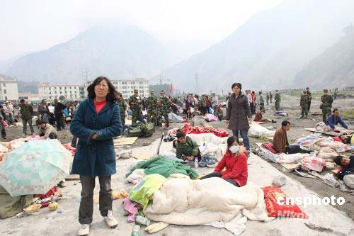 5月15日,等待救助的汶川縣災民。由于陸路交通尚未恢復,重傷員只能等待直升機轉(zhuǎn)運到成都救治。中新社發(fā) 張雷 攝
