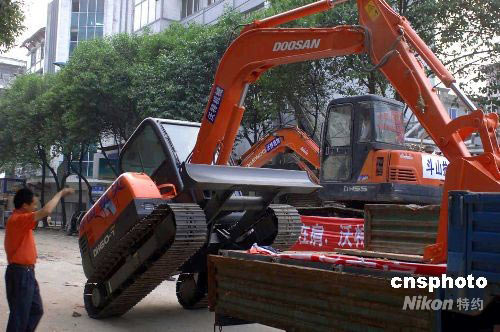 2008年5月15日,地震災(zāi)區(qū)都江堰市危樓排險(xiǎn)工作正在進(jìn)行中。目前來自成都市企業(yè)的志愿抗震救災(zāi)隊(duì)伍攜帶大型機(jī)械車輛開進(jìn)都江堰市區(qū),與解放軍部隊(duì)一起展開危樓居民區(qū)的排險(xiǎn)、救災(zāi)、防疫工作。圖為成都市一企業(yè),派數(shù)量可觀的大小挖掘機(jī)和破損機(jī)進(jìn)入江堰市危樓疏散區(qū)。汶川7.8級(jí)地震,給都江堰市帶來巨大破壞。目前危樓居民區(qū)疏散、安置工作已展開,取得一定成果。中新社發(fā) 鄒憲 攝