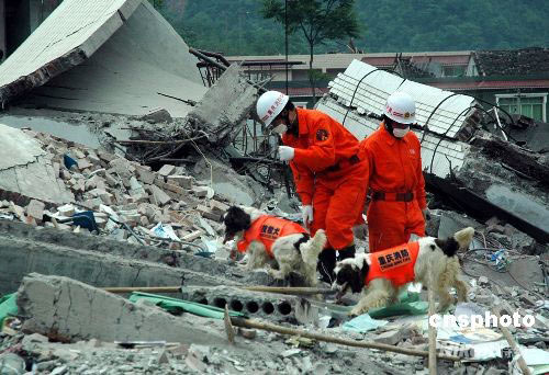 5月15日,四川地震重災(zāi)區(qū)北川縣,重慶消防官兵動用搜救犬在北川中學廢墟中搜尋幸存者。中新社發(fā) 萬明 攝