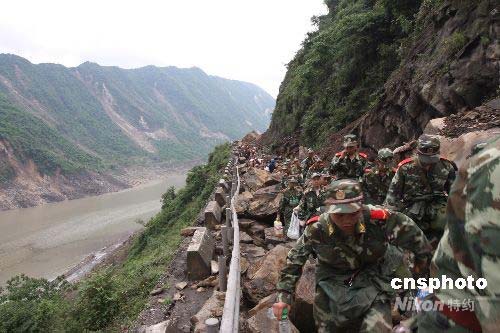 來自交通運(yùn)輸部的最新消息,從北、東、南三個方向通往汶川的道路目前仍在緊急搶修中。已全線搶通的西線道路因再次發(fā)生滑坡、泥石流災(zāi)害,受損十分嚴(yán)重,目前塌方路段能夠維持通行,但隱患較多。圖為5月14日逾千官兵徒步緊急趕往受災(zāi)嚴(yán)重的映秀鎮(zhèn)情景。中新社發(fā) 黃榮 攝