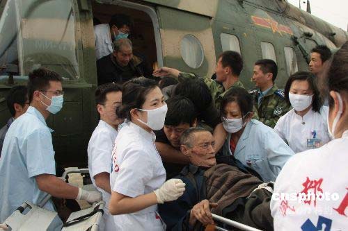 連日來,中國空軍連續(xù)出動軍用直升機到四川重災區(qū)緊急搶運危重傷員,及時送到成都進行救治,為挽救幸存者生命贏得時間。圖為5月15日,空軍航空兵某搜救團轉移傷員的情景。中新社發(fā) 譚超 攝