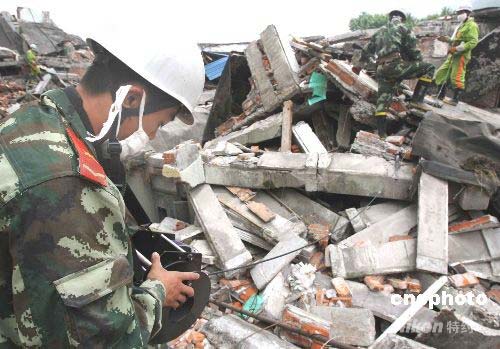 圖:消防武警映秀用生命探測儀搜索幸存者