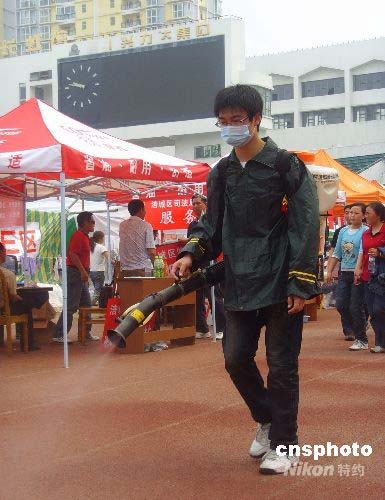 圖:綿陽(yáng)志愿者在災(zāi)民安置點(diǎn)噴灑消毒液