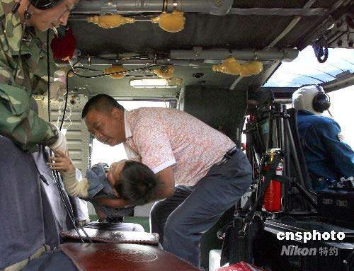 圖:茂縣受重男孩被送上直升飛機(jī)