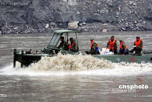 圖:成都軍區(qū)官兵出動(dòng)軍用船運(yùn)送災(zāi)民