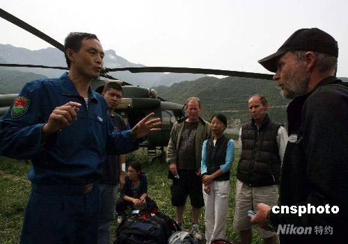 五月十八日,三名美國游客和三名澳大利亞游客以及一名丹麥游客從茂縣登上救援的成都軍區(qū)陸軍航空兵某團(tuán)的直升飛機(jī),搭乘王牌飛行員姜機(jī)長的飛機(jī)撤回“天府之國”四川省會成都。這批來九寨溝的游客被困在地震災(zāi)區(qū)己經(jīng)七天,之前先通過軍方的海事衛(wèi)星電話,分別向海外親人報(bào)告了平安。 中新社發(fā) 賈國榮 攝
