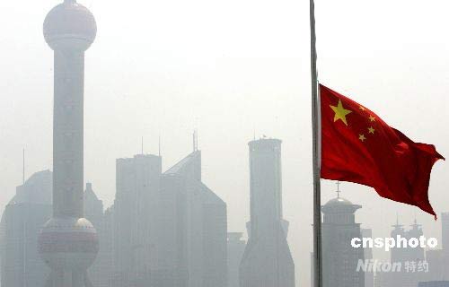 5月19日全國哀悼日,上海下半旗沉痛哀悼四川地震遇難同胞。為表達全國各族人民對四川汶川大地震遇難同胞的深切哀悼,國務院決定,2008年5月19日至21日為全國哀悼日。在此期間,全國和各駐外機構下半旗志哀,停止公共娛樂活動,外交部和中國駐外使領館設立吊唁簿。5月19日14時28分起,全國人民默哀3分鐘,屆時汽車、火車、艦船鳴笛,防空警報鳴響。中新社發(fā) 湯彥俊 攝