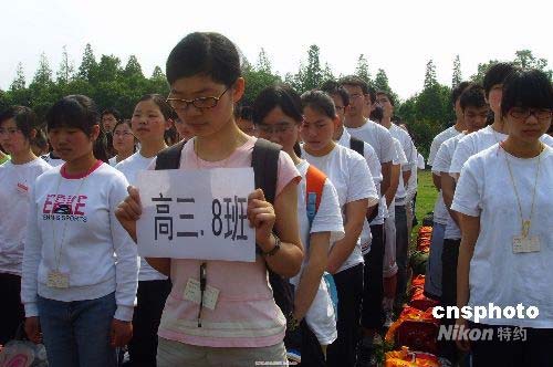 圖:北川中學(xué)復(fù)課學(xué)生默哀悼念故者