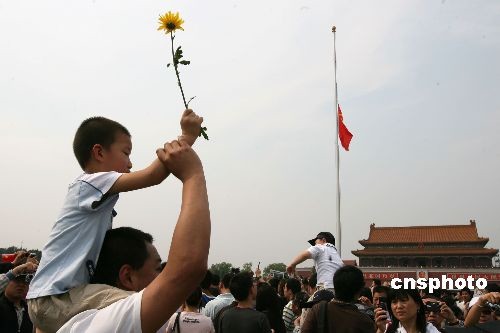 5月19日14時28分,數(shù)萬民眾在北京天安門廣場為四川汶川大地震遇難者默哀,一名兒童騎在父親肩頭高舉黃菊花表達(dá)哀思。5月19日至21日為中國全國哀悼日。中新社發(fā) 王瑤 攝