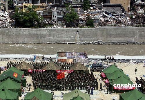 5月19日下午14時(shí)28分,四川省汶川大地震核心重災(zāi)區(qū)映秀鎮(zhèn)一派肅穆,背靠成片的廢墟與湍急的岷江,率先進(jìn)入該鎮(zhèn)救險(xiǎn)的武警四川總隊(duì)官兵面對(duì)國(guó)旗默哀三分鐘。中新社發(fā) 任晨鳴 攝