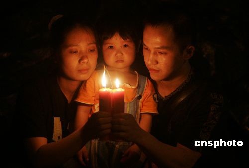 5月19日晚,四川省什邡市市民黎云震一家在帳篷外點燃紅蠟燭為地震死難者默哀。1976年7月28日出生的黎云震,生日那天正是唐山大地震之時,黎云震的母親為他起名云震。也許巧合,512四川大震當日,正是黎云震女兒的2周歲生日。