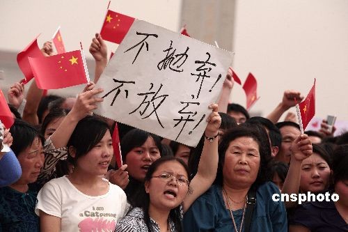 2008年5月20日,全國哀悼日第二天,民眾在北京天安門廣場揮舞著國旗,為四川加油,希望災民早日度過難關。中新社發(fā) 崔奉霞 攝