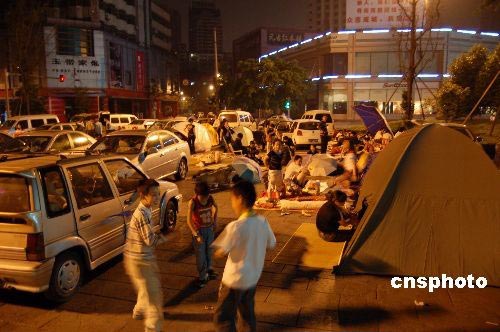 5月20日晚上,四川成都市民再次紛紛走出家門(mén)來(lái)到空曠地帶,或者睡在車(chē)上,或者在帳篷中,躲避余震。五月十九日晚間官方發(fā)布四川汶川大地震兩天內(nèi)可能發(fā)生六至七級(jí)余震的消息,當(dāng)晚成都市民紛紛在街頭避震。中新社發(fā) 劉萬(wàn)強(qiáng) 攝