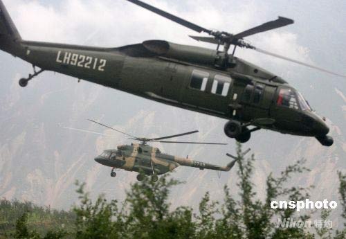 5月22日是汶川大地震的第十一天,成都軍區(qū)陸航團(tuán)密集飛行,空降帳篷等救災(zāi)急需物資到受災(zāi)嚴(yán)重的高山羌寨。中新社發(fā) 賈國(guó)榮 攝