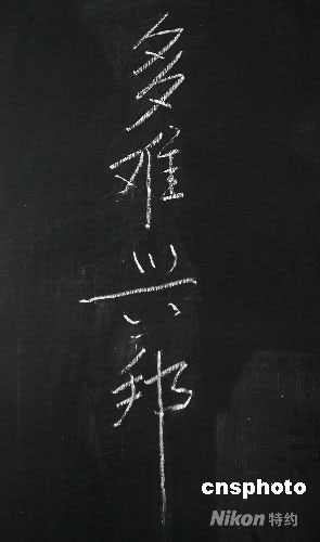 溫家寶總理5月23日在看望臨時安置在四川綿陽長虹培訓(xùn)中心北川中學(xué)高三同學(xué)時,用粉筆在黑板上寫下的“多難興邦”四個大字。中新社發(fā) 蒲滔 攝