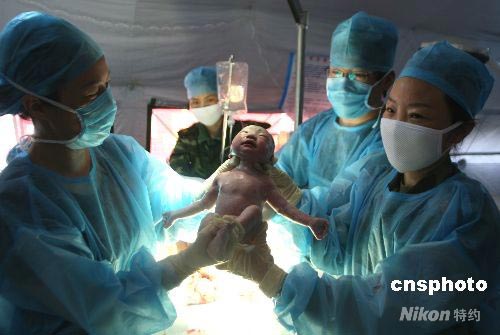 5月23日上午9時28分,在四川綿陽平武縣南壩鎮(zhèn)濟(jì)南軍區(qū)醫(yī)療救護(hù)站的軍醫(yī)為水觀鄉(xiāng)大溝村29歲的婦女賈鳳平順利接生了一個七個月大的早產(chǎn)女嬰。父親蘇德奎為孩子起名叫“蘇震生”。 中新社發(fā) 畢華明 攝