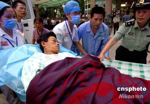 5月25日傍晚,24名四川地震災區(qū)重傷員從成都乘坐航班抵達福州后隨即由救護車隊護送至南京軍區(qū)福州總醫(yī)院僑賓樓接受救治。圖為傷員抵達南京軍區(qū)福州總醫(yī)院后該院醫(yī)護人員全力救治每一位來自四川地震災區(qū)的傷員。中新社發(fā) 劉可耕 攝
