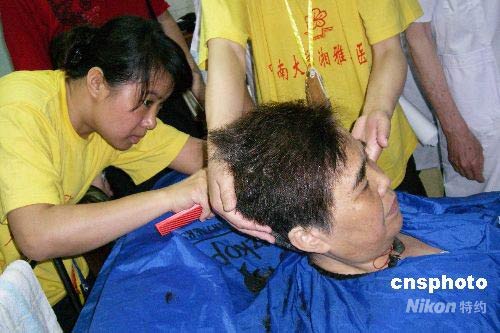 圖:湖南青年志愿者為災(zāi)區(qū)傷員理發(fā)