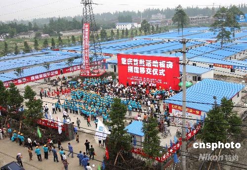 由重慶市政府捐助、南岸區(qū)承建的一萬平方米、500套輕型結(jié)構(gòu)活動保暖住房5月27日在四川都江堰落成,數(shù)千都江堰受災(zāi)民眾將于近日入住,成為“重慶村”一員。中新社發(fā) 趙振清 攝
