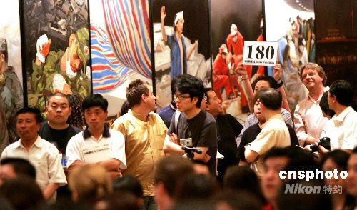 5月28日凌晨,“共同渡過(guò)·中國(guó)當(dāng)代藝術(shù)界賑災(zāi)義拍”在北京圓滿落幕,值得一提的是,由29名寫(xiě)實(shí)畫(huà)派藝術(shù)家集體創(chuàng)作的以抗震救災(zāi)為主題的油畫(huà)作品參與了拍賣(mài),并在43輪競(jìng)價(jià)后拍出了3350萬(wàn)元的天價(jià)。這場(chǎng)拍賣(mài)持續(xù)4個(gè)小時(shí),全場(chǎng)總成交額一舉突破5100萬(wàn)元人民幣,全部拍賣(mài)所得將通過(guò)中華慈善總會(huì)捐獻(xiàn)四川地震災(zāi)區(qū)。中新社發(fā) 楊可佳 攝
