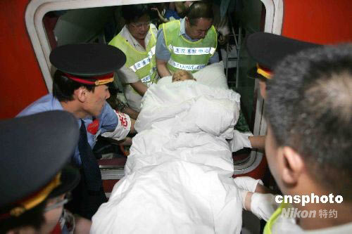 5月28日,首批91位四川災(zāi)區(qū)傷員抵達(dá)北京接受治療,這批傷員分別來(lái)自地震災(zāi)區(qū)的綿陽(yáng)和德陽(yáng),其中15歲以下的12人,70歲以上的3人。傷員病情基本穩(wěn)定,傷情主要為四肢骨折等肢體外傷。傷員乘專列從綿陽(yáng)火車站抵達(dá)北京,到京后他們被送往北京老年醫(yī)院治療。中新社發(fā) 富田 攝