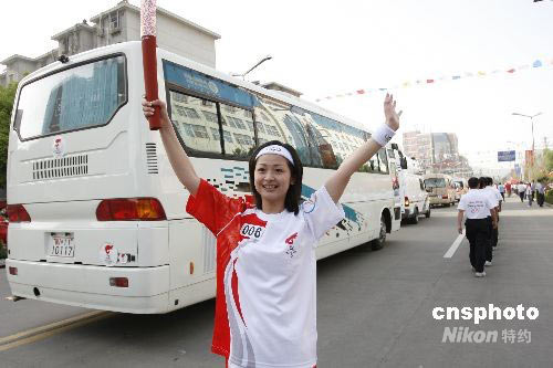 5月29日,奧運(yùn)圣火在“能源之都”淮南傳遞。圖為與白血病魔頑強(qiáng)斗爭的女大學(xué)生,奧運(yùn)火炬手孫潔,她高舉火炬并為四川加油。她說她的生命奇跡不僅來自她的堅強(qiáng)毅力,更是來自社會的愛。她告訴四川人民,我們一起加油。 中新社發(fā) 張婭子 攝