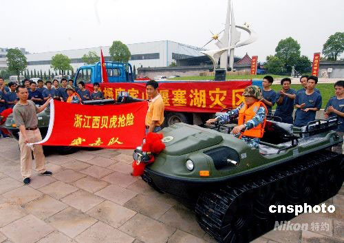 5月30日上午,浙江義烏,兩輛“西貝虎”水陸兩棲全地形車啟程前往四川北川唐家山堰塞湖搶險。目前唐家山堰塞湖的總儲水量已達1.4億立方米,而且每天以500立方米的速度遞增,一旦發(fā)生潰壩,將危及下游130多萬人的生命財產(chǎn)。28日剛從什邡回來的義烏西貝文良特種車輛有限公司領(lǐng)導,又接到唐家山堰塞湖防洪搶險指揮部急需用水陸兩棲全地形車電話。該公司連夜組織加班,突擊生產(chǎn)了兩輛性能最優(yōu)的水陸兩棲全地形車,并根據(jù)唐家山堰塞湖搶險可能遇到的困難,增配了自動牽引鉤、牽引鋼絲繩、爬坡履帶、水上推進的螺旋槳等。30日中午,陳根林等四名剛從什邡抗震救災前線回來的公司職工,組成“西貝虎”搶險突擊隊,再赴抗震救災前線搶險。中新社發(fā) 張建成 攝