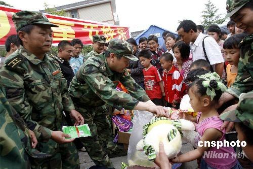 五月三十一日,四川省都江堰市紫坪鋪鎮(zhèn)望江村的孩子們收到了部隊贈送的兒童節(jié)禮物。四川預(yù)備役高射炮步兵師四團負責(zé)都江堰市望江、黎明、白沙三個行政村的救災(zāi)工作。兒童節(jié)前夕,該團為孩子們準(zhǔn)備了書包、玩具,送給當(dāng)?shù)氐暮⒆觽。中新社發(fā) 慎重 攝