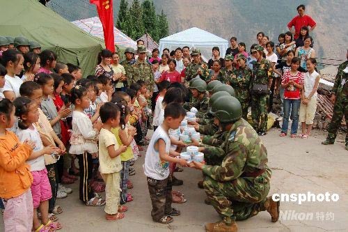 5月31日,在四川綿竹市金花小學(xué)校址的廢墟旁邊,38名在地震中幸存的小學(xué)生和中國(guó)空降兵“上甘嶺特功八連”所在團(tuán)的官兵們一起迎接“六一”兒童節(jié)。地震災(zāi)害發(fā)生以后,該團(tuán)是首支進(jìn)駐金花鎮(zhèn)執(zhí)行抗震救災(zāi)任務(wù)的部隊(duì)。在“六一”兒童節(jié)來(lái)臨之際,官兵們和孩子們一起在小學(xué)倒塌的廢墟邊舉行升旗儀式,唱起國(guó)歌。官兵們還向孩子們贈(zèng)送用自發(fā)捐款購(gòu)買(mǎi)的學(xué)習(xí)和生活用品。中新社發(fā) 陳翊 攝