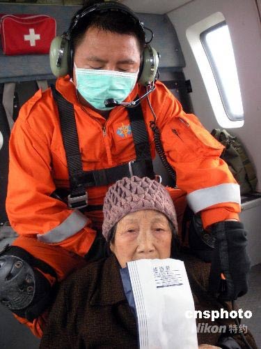 5月31日,90歲老奶奶被民航直升機南航珠海S76型7307號飛機成功救出。家住綿竹市清平天池南木溝的老人,地震前獨居深山。5.12汶川地震發(fā)生時,老人在室外乘涼,腰部被山石擊傷。因出山和進山路中斷與外界隔絕聯(lián)系,一直被困深山中。19天來靠吃野菜維持生命。民航直升機抗震救災基地接到綿竹搜救部隊的消息后,當即派出兩個機長劉洋、段俊德執(zhí)行飛行任務,交通部南海第一飛行隊救生員李春林、絞車手宋樂平一同前往。由于地形復雜,山式狹隘,峽谷電線縱橫交錯,沒有可著地條件,搜救人員只好實施空中救援。上午10時40分成功將老人救出。中新社發(fā) 張鈺昱 攝
