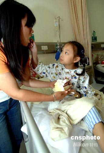 六月一日,福建省立醫(yī)院愛心病房,經過兩次截肢的四川地震災區(qū)受傷小女孩楊芹正在給媽媽喂蛋糕。在“5.12”汶川大地震中,楊芹的右腿被水泥板壓了近20個小時,右大腿以下部分嚴重骨折、感染,神經、肌肉等組織大量壞死,在一周之內做了兩次截肢手術,失去整條右腿。她后來被轉到福建省立醫(yī)院愛心病房接受治療。中新社發(fā) 王東明 攝