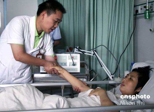 6月2日,廣西醫(yī)科大學(xué)第一附屬醫(yī)院康復(fù)技師龍耀斌在給傷員郭昌碧做術(shù)后康復(fù)訓(xùn)練。據(jù)了解,該醫(yī)院對(duì)第一期55例四川地震傷員實(shí)施手術(shù)已全部完成,目前治療的重點(diǎn)開始向康復(fù)轉(zhuǎn)移,主要包括心理康復(fù)和肌體功能的康復(fù),已有心理醫(yī)生和理療師開始介入到康復(fù)治療當(dāng)中。中新社發(fā) 林艷華 攝