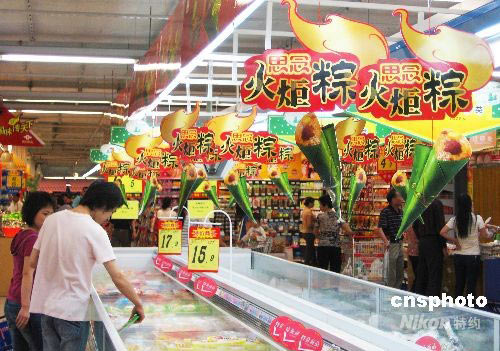 6月2日,廣西北海市一家超市應(yīng)即將到來的中國(guó)傳統(tǒng)節(jié)日端午節(jié)而推出奧運(yùn)“火炬粽”,其獨(dú)特的火炬造型和“祝福北京奧運(yùn)”的寓意,吸引了不少顧客選購(gòu)。隨著2008北京奧運(yùn)會(huì)的臨近,商家紛紛借機(jī)推出具有奧運(yùn)元素的商品促銷。 中新社發(fā) 范靜 攝