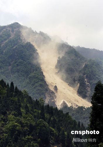 六月四日,位于四川省彭州市境內(nèi)的龍門(mén)山銀廠溝附近再次發(fā)生余震及山體滑坡。距離成都市區(qū)二十公里的彭州以旅游業(yè)為經(jīng)濟(jì)命脈,在龍門(mén)山鎮(zhèn)大山深處的銀廠溝海拔兩千余米,是國(guó)家級(jí)著名風(fēng)景區(qū)。龍門(mén)山大斷點(diǎn)、龍門(mén)山后斷裂、龍門(mén)山主斷裂、龍門(mén)山邊緣斷裂,這幾條斷裂帶是這次汶川特大地震和達(dá)七千次余震的策源地之一。而龍門(mén)山鎮(zhèn)與震中汶川僅一山之隔,站在銀廠溝旁的龍頭山上,就能俯瞰汶川縣城。中新社發(fā) 慎重 攝
