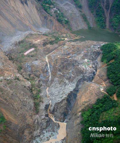 6月7日8點12分,唐家山堰塞湖開始泄流,湖水通過泄流槽流出。20分鐘后,泄流水頭到達(dá)湔江河床。圖為空中俯拍的唐家山堰塞湖泄流情景。中新社發(fā) 楊衛(wèi)華 攝